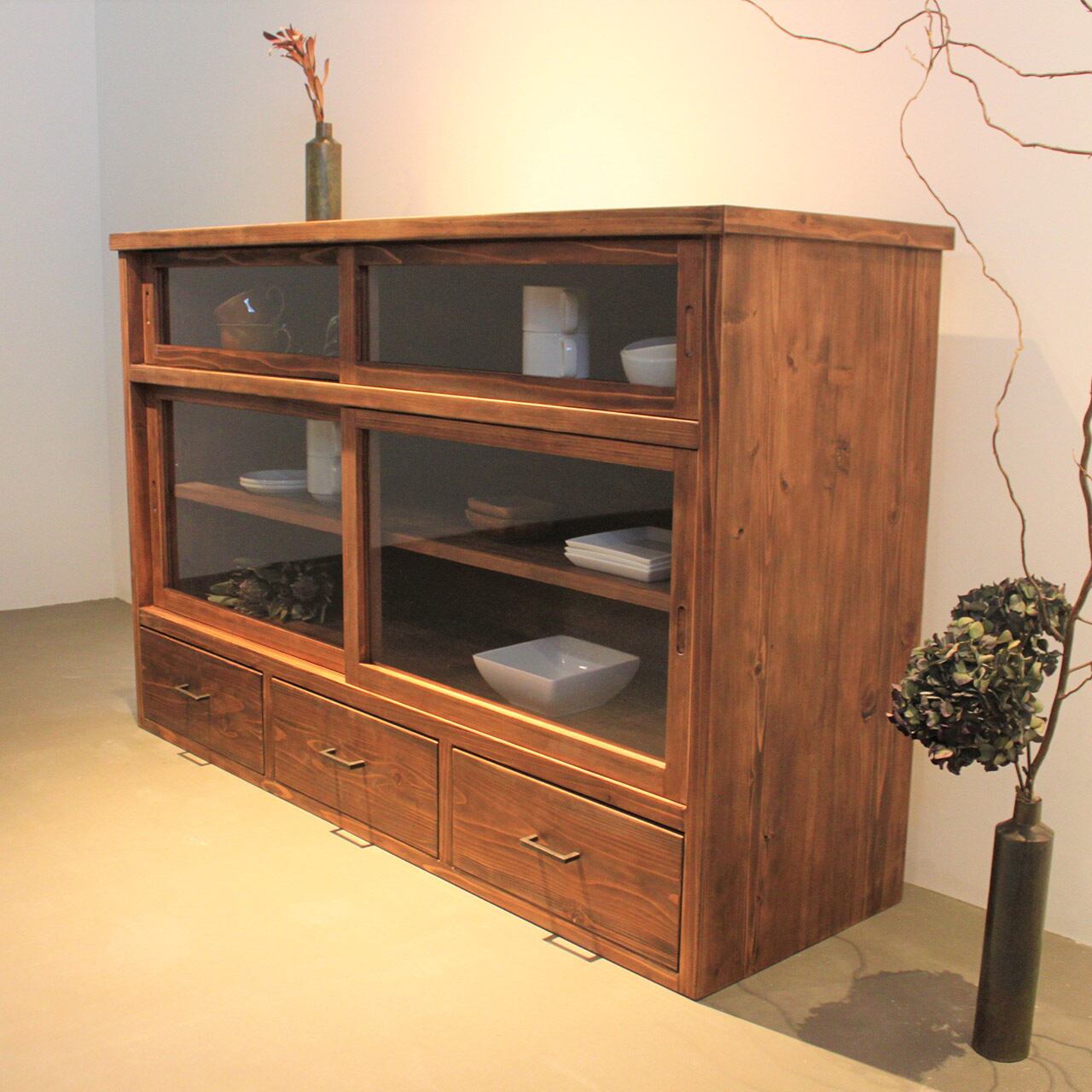 古き良き時代をイメージして濃い目の塗装をしました。大きなガラス戸は大好きな食器を並べて見せる収納に。